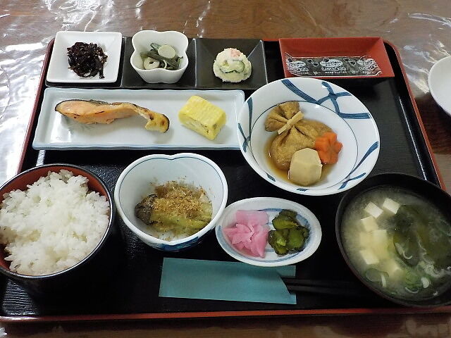 和定食。巾着煮、鮭の塩焼き・卵焼き、焼き茄子、3点盛り、焼き海苔