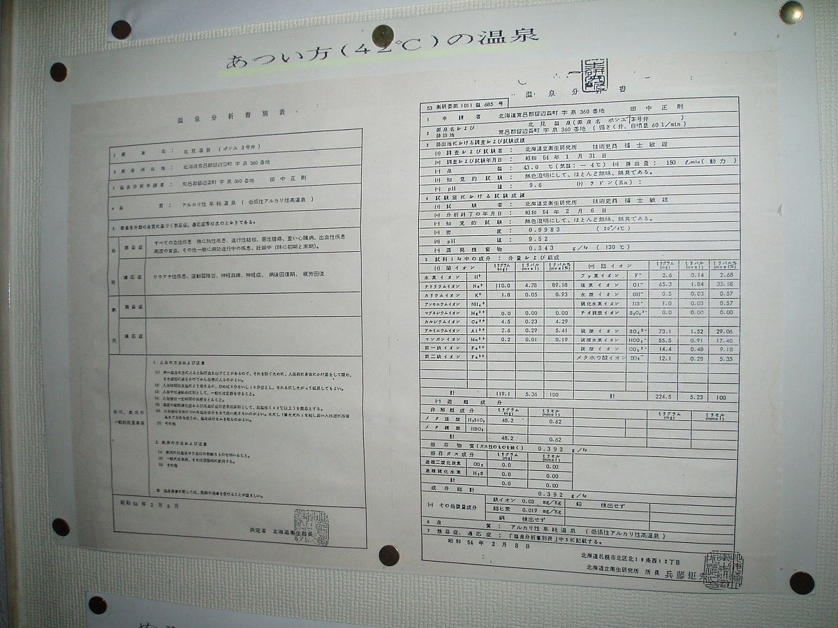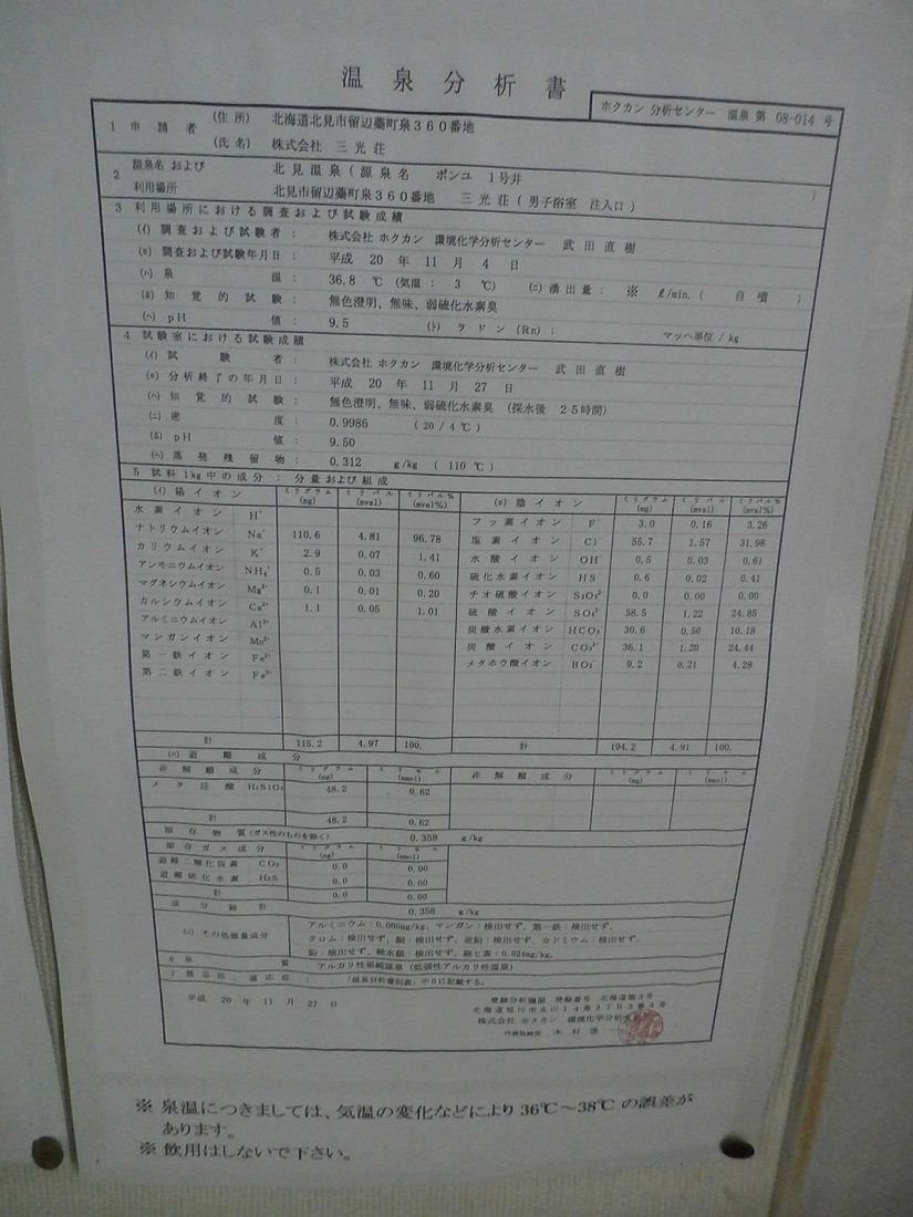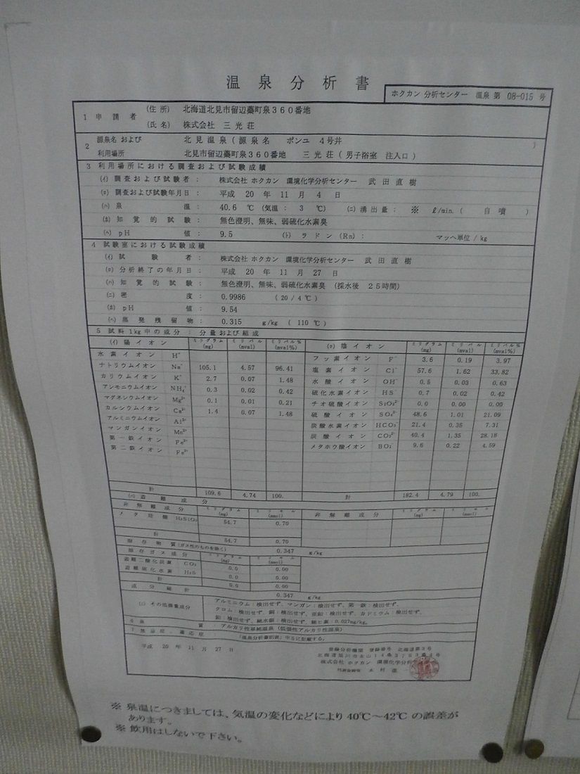 ◇4号井温泉分析書(熱い方の温泉、廊下掲示)