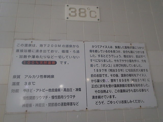 小浴槽と打たせ湯は簡易な仕切りはあるが湯は繋がっている。打たせ湯もポンユ1号井を使用している。1号井は昭和32年掘削完了した温泉であって、昔から存在していた自然湧出とは異なる(旧温泉分析書参照)。