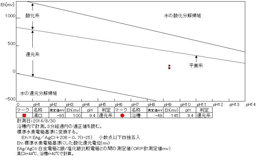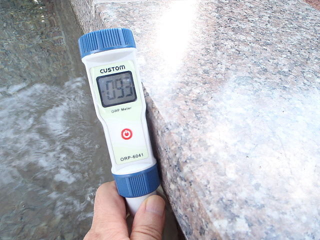 2014/8/30、15時25分~15時35分、浴槽内でORP計測(湯口はミニボトルで受け流し)。源泉100%掛け流しで、塩素系薬剤未使用。