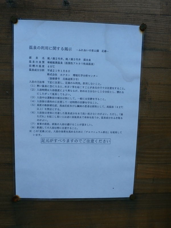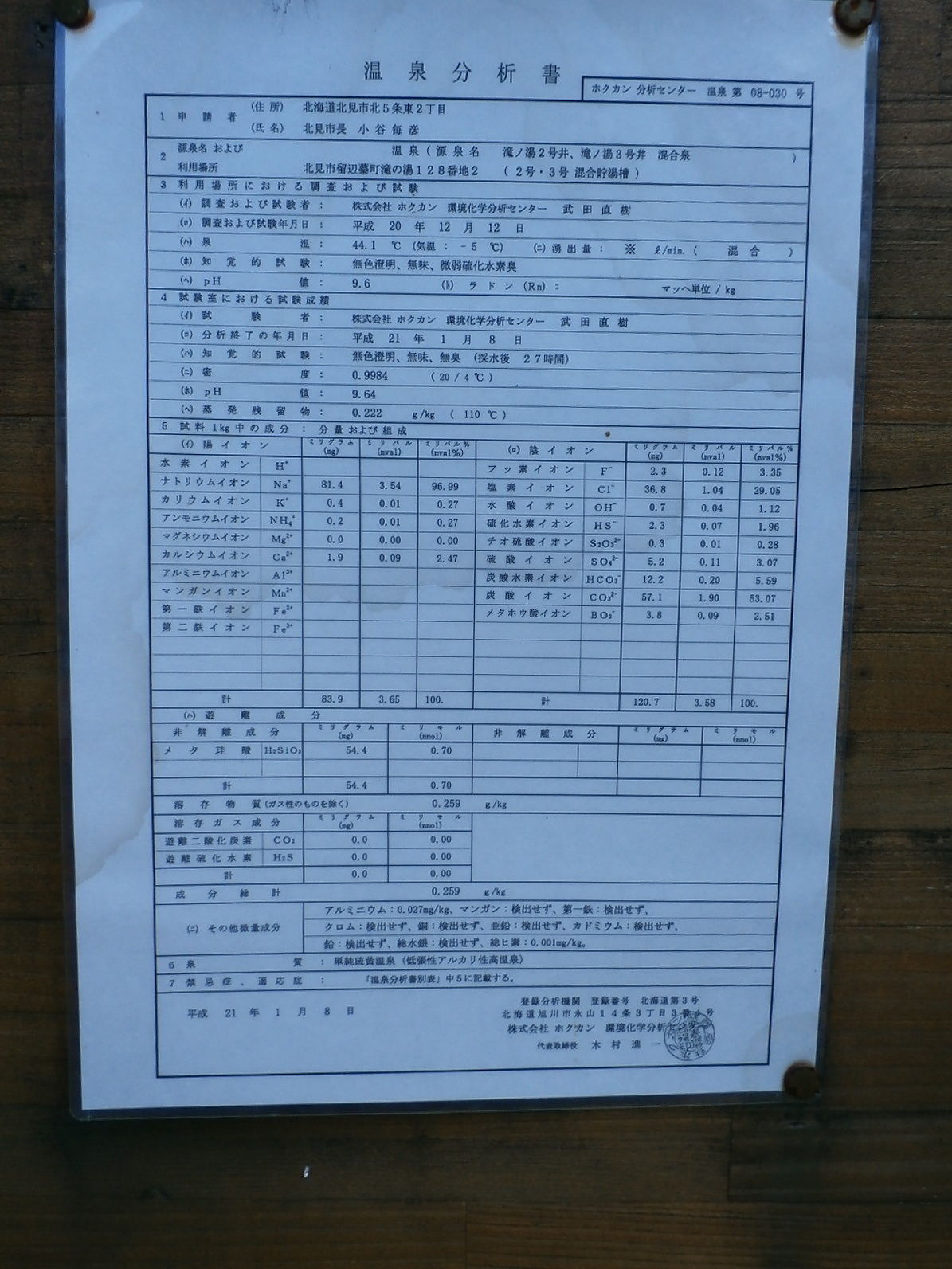 平成21年1月8日に作成した温泉分析書(ホクカン環境化学分析センター)。泉温(2号・3号混合貯湯槽):44.1℃(気温:-5℃)、湧出量:※ℓ/分(動力揚湯)、pH値:9.6、溶存物質:0.259g/kg、成分総計:0.259g/kg、泉質:単純硫黄泉(低張性アルカリ性高温泉)(旧泉質名:単純硫黄泉)