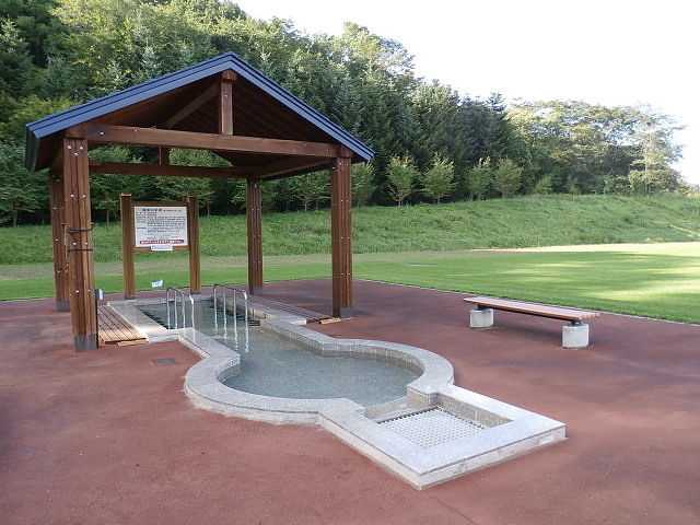 「滝の湯センター夢風泉」の背後に広がる滝の湯ふれあいの里公園にある足湯。平成19年4月、老人ホーム静楽園の跡地に整備されたもの。公園内にパークゴルフ場(9ホール)を設置している。左手の三角屋根の建物は湯小屋。奥にあって分かりにくいのか閑散としている。