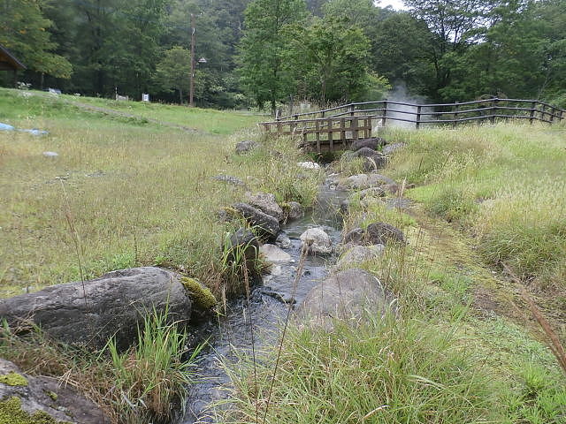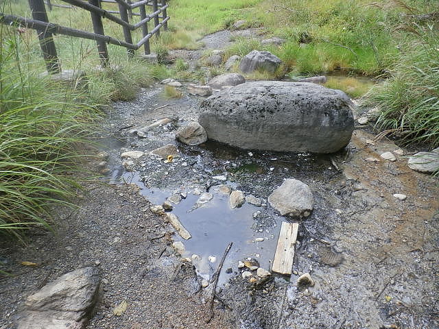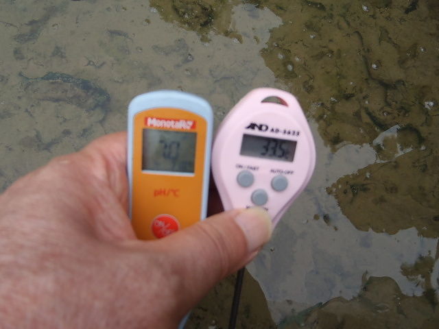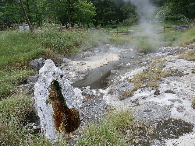普段はもっと高温だが、雨で柵内に流入する沢水が増えて湯温が下がったようだ。