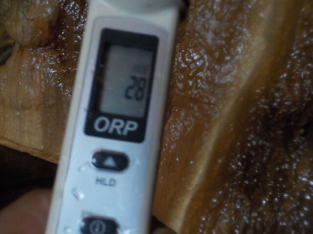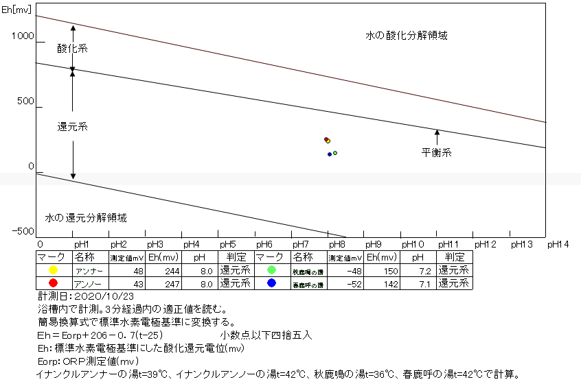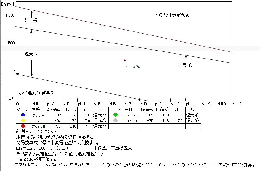 2020/10/23、15時30分~16時、浴槽内でORP計測(岩壁湯はミニボトルで採水)。源泉100%掛け流しで、塩素系薬剤未使用。