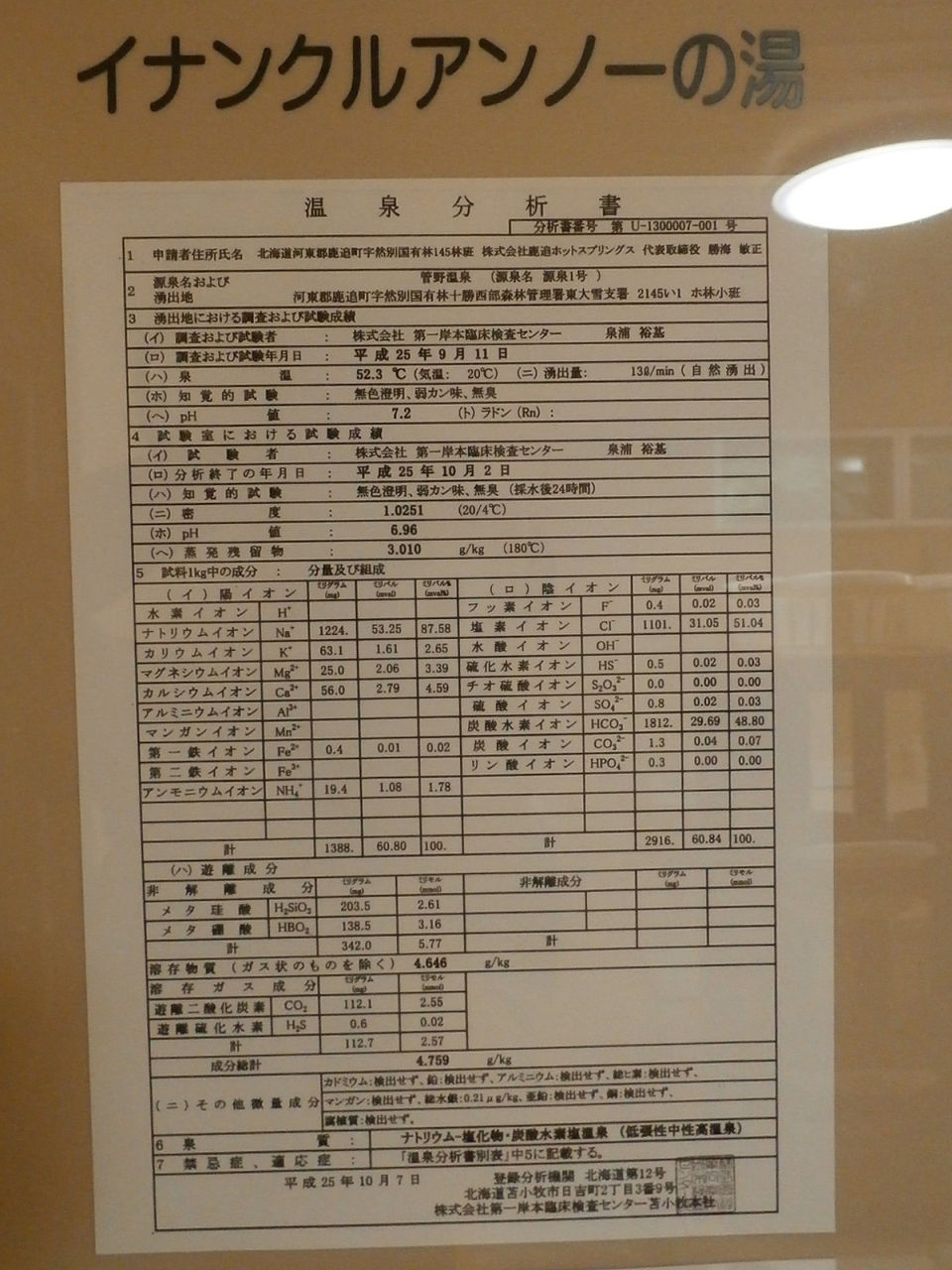 平成25年10月7日に作成した温泉分析書(第一岸本臨床検査センター苫小牧本社)。泉温:52.3℃(気温:20℃)、湧出量:13ℓ/分(自然湧出)、pH値:7.2、溶存物質:4.646g/kg、成分総計:4.759g/kg、泉質:ナトリウム-塩化物・炭酸水素塩泉(低張性中性高温泉)(旧泉質名:含重曹-食塩泉)