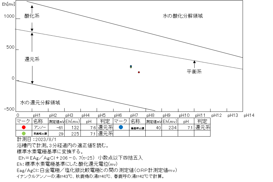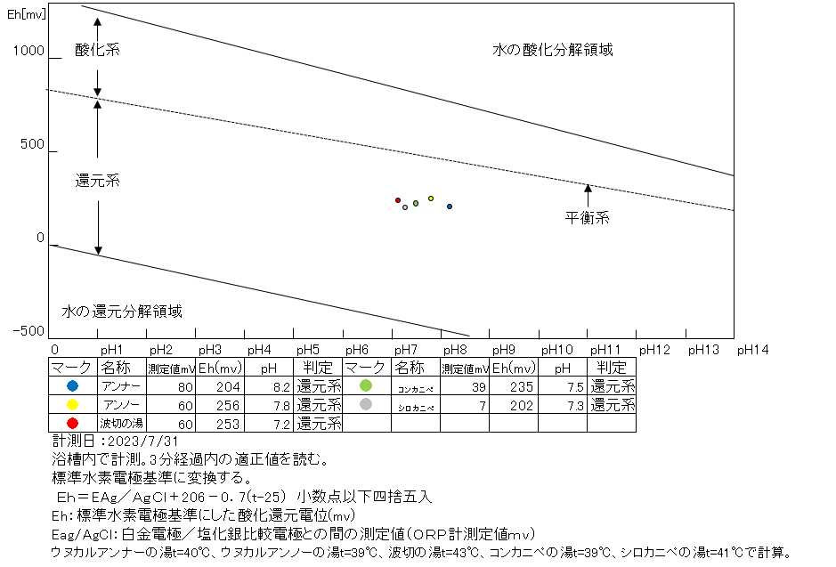 岩壁湯:温度41.2℃、pH7.20、ORP値は-107mvに収束した。