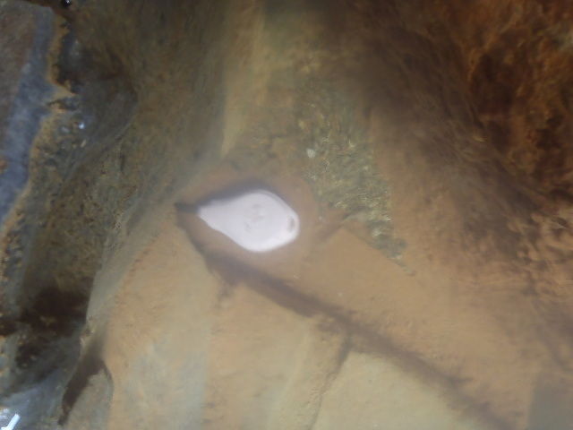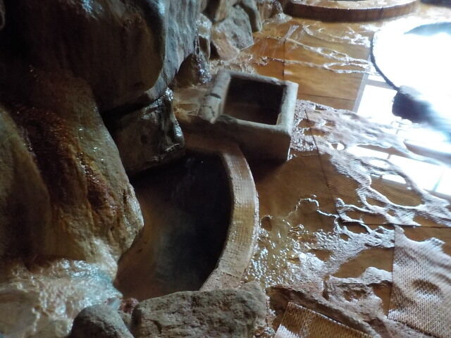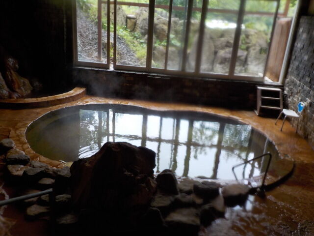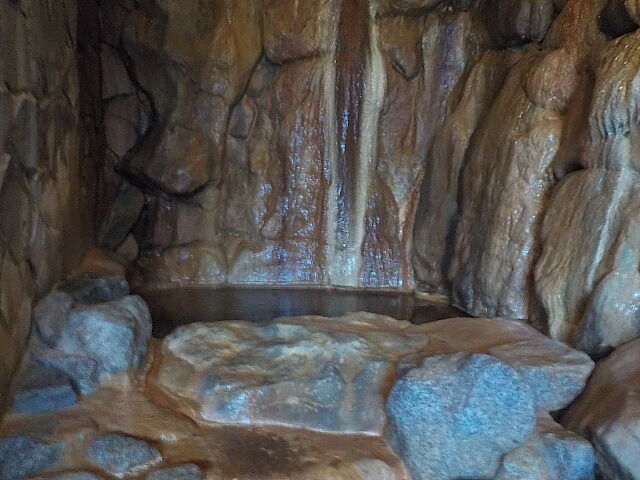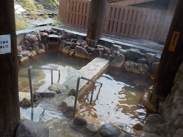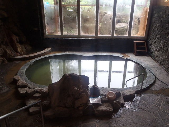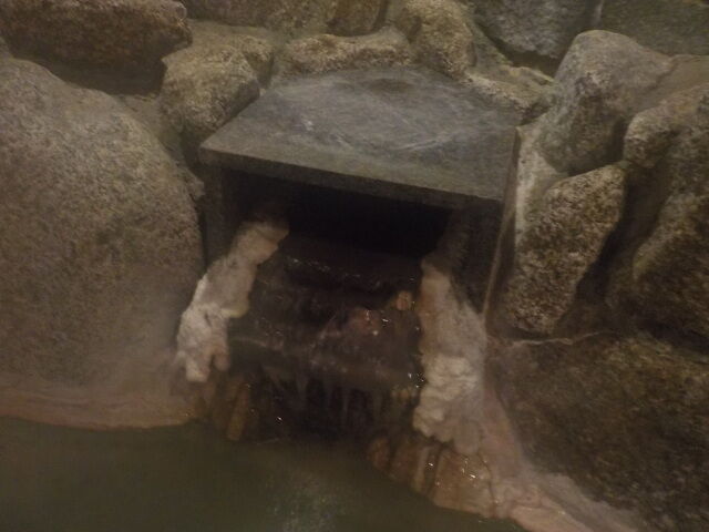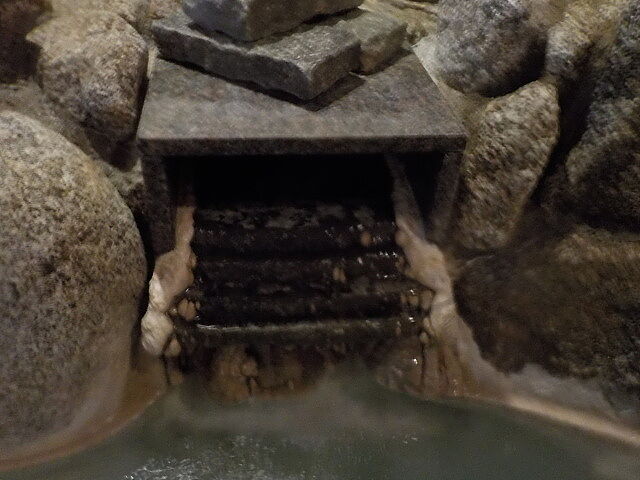 楕円形の波切の湯(旧・毘沙門の湯)は笹濁り色微濁の湯。源泉3号利用。福禄寿のような湯口から約20ℓ/分注湯。知覚的には、微弱金気炭酸臭、微弱金気炭酸塩味。溢れた湯は湯縁からオーバーフローしている。つるすべ感あるが、次第にキシキシ感と拮抗する。