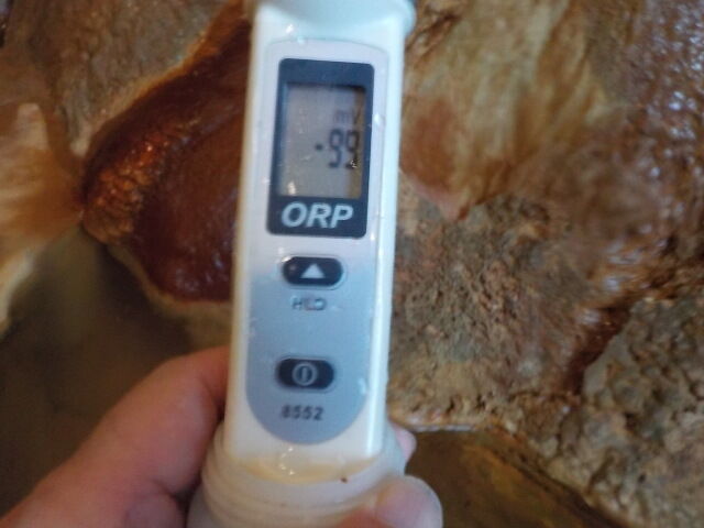 湯口:温度61.3℃、pH7.49、ORP値は-150mvに収束した。