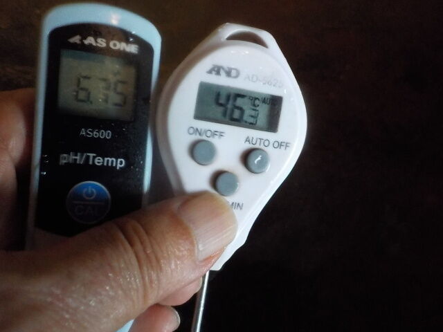 湯口:温度46.7℃、pH6.87、ORP値は-142mvに収束した。