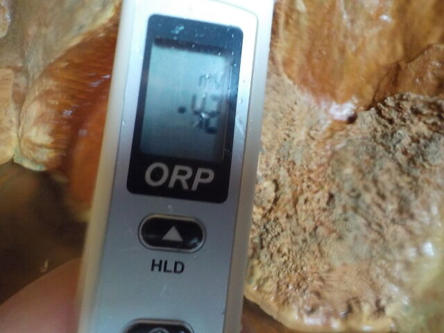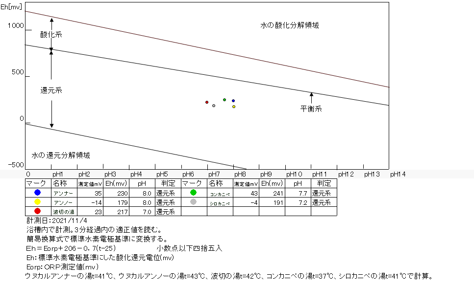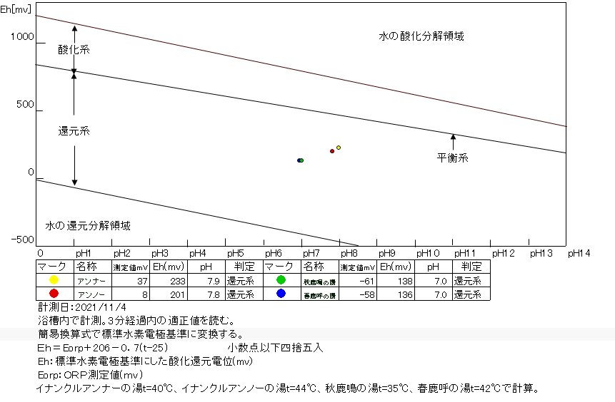 2021/11/4、20時10分~40分、浴槽内でORP計測(湯口はミニボトルで採水し、50℃で測定開始)。源泉100%掛け流しで、塩素系薬剤未使用。