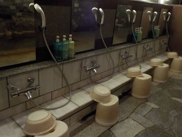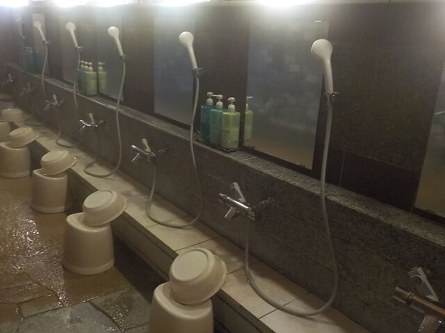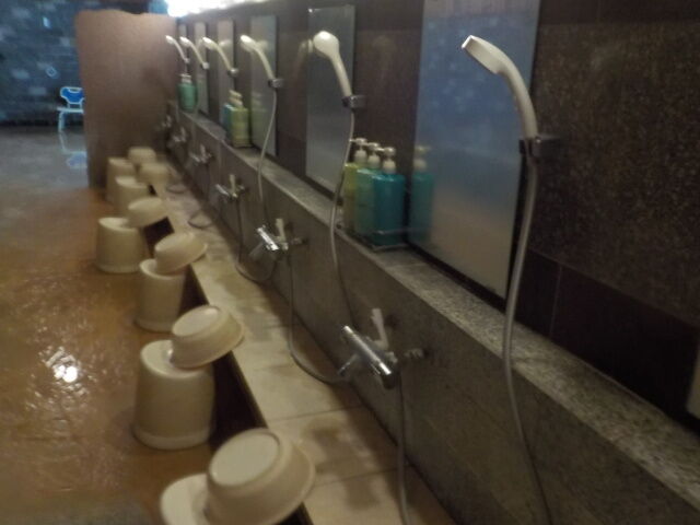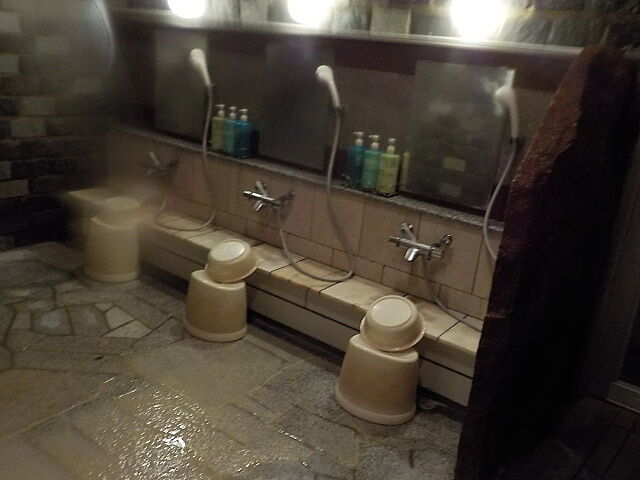 階段手前側の浴室に、ウヌカルアンナーの湯、ウヌカルアンノーの湯を配置。シャワー付きカラン8台、上がり湯、シャンプー・コンディショナー・ボディソープあり。洗い場周辺は析出物で変色し、クレーター紋様になっている。