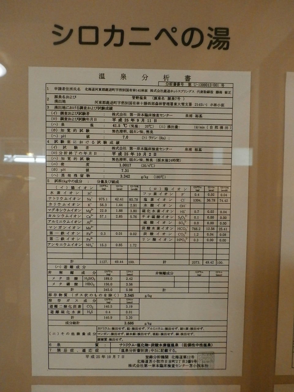 平成25年10月7日に作成した温泉分析書(第一岸本臨床検査センター苫小牧本社)。泉温:56.4℃(気温:20℃)、湧出量:ℓ/分(自然湧出)、pH値:7.8、溶存物質:3.600g/kg、成分総計:3.601g/kg、泉質:ナトリウム-塩化物・炭酸水素塩温泉(低張性中性高温泉)(旧泉質名:含重曹-食塩泉)