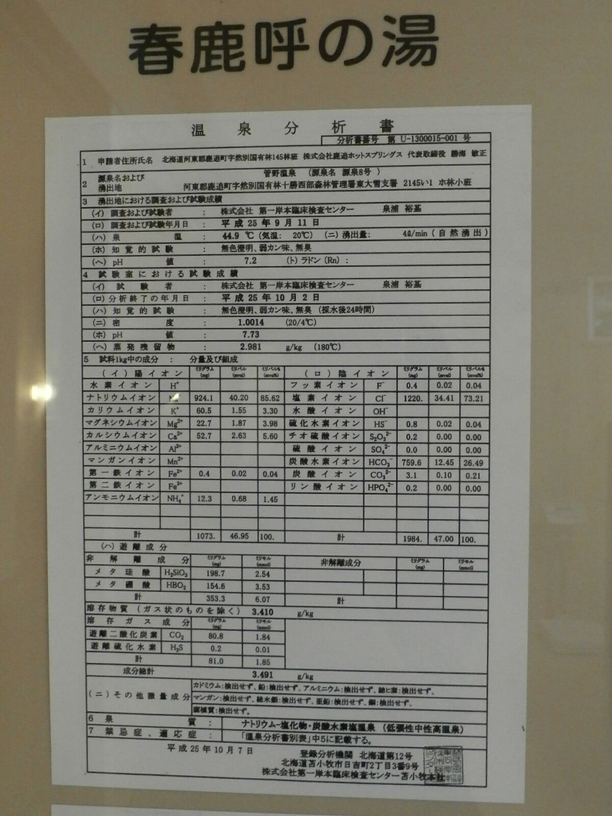 平成25年10月7日に作成した温泉分析書(第一岸本臨床検査センター苫小牧本社)。泉温:44.9℃(気温:20℃)、湧出量:4ℓ/分(自然湧出)、pH値:7.2、溶存物質:3.410g/kg、成分総計:3.491g/kg、泉質:ナトリウム-塩化物・炭酸水素塩泉(低張性中性高温泉)(旧泉質名:含重曹-食塩泉)