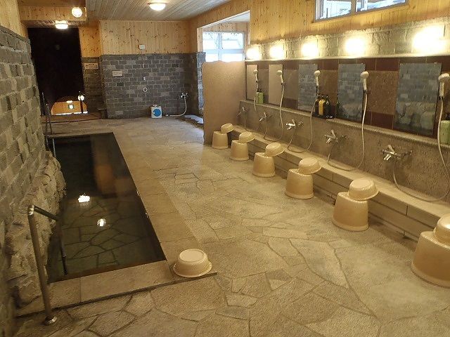 敷石床の浴室に、イナンクルアンナーの湯、イナンクルアンノーの湯を配置。シャワー付きカラン9台(6台+3台)、上がり湯、シャンプー・コンディショナー・ボディソープあり。