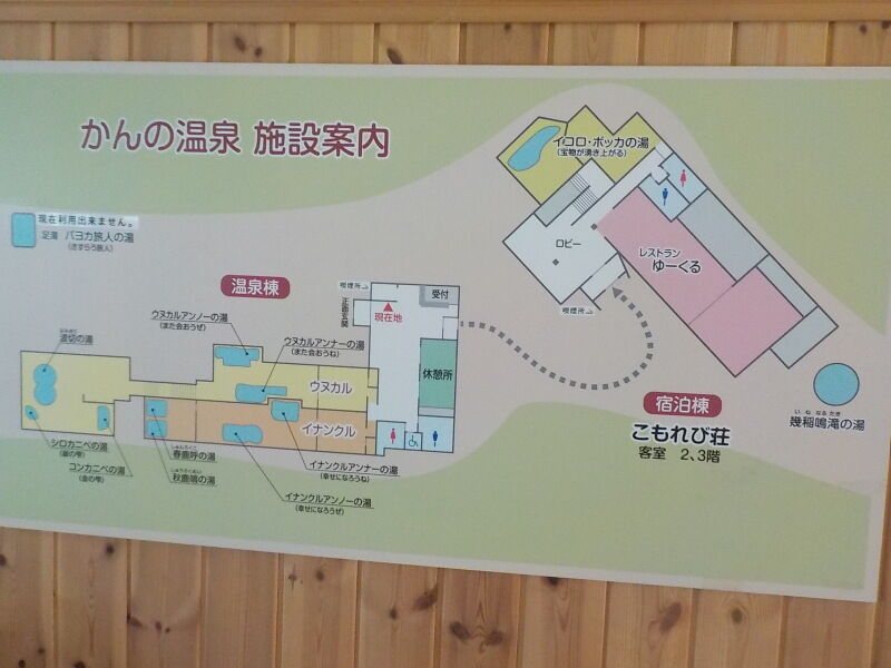左側が湯処イナンクル。宿泊客はチェックイン~翌朝9時30分まで(20時に男女入れ替え有り)。貴重品ロッカー有。