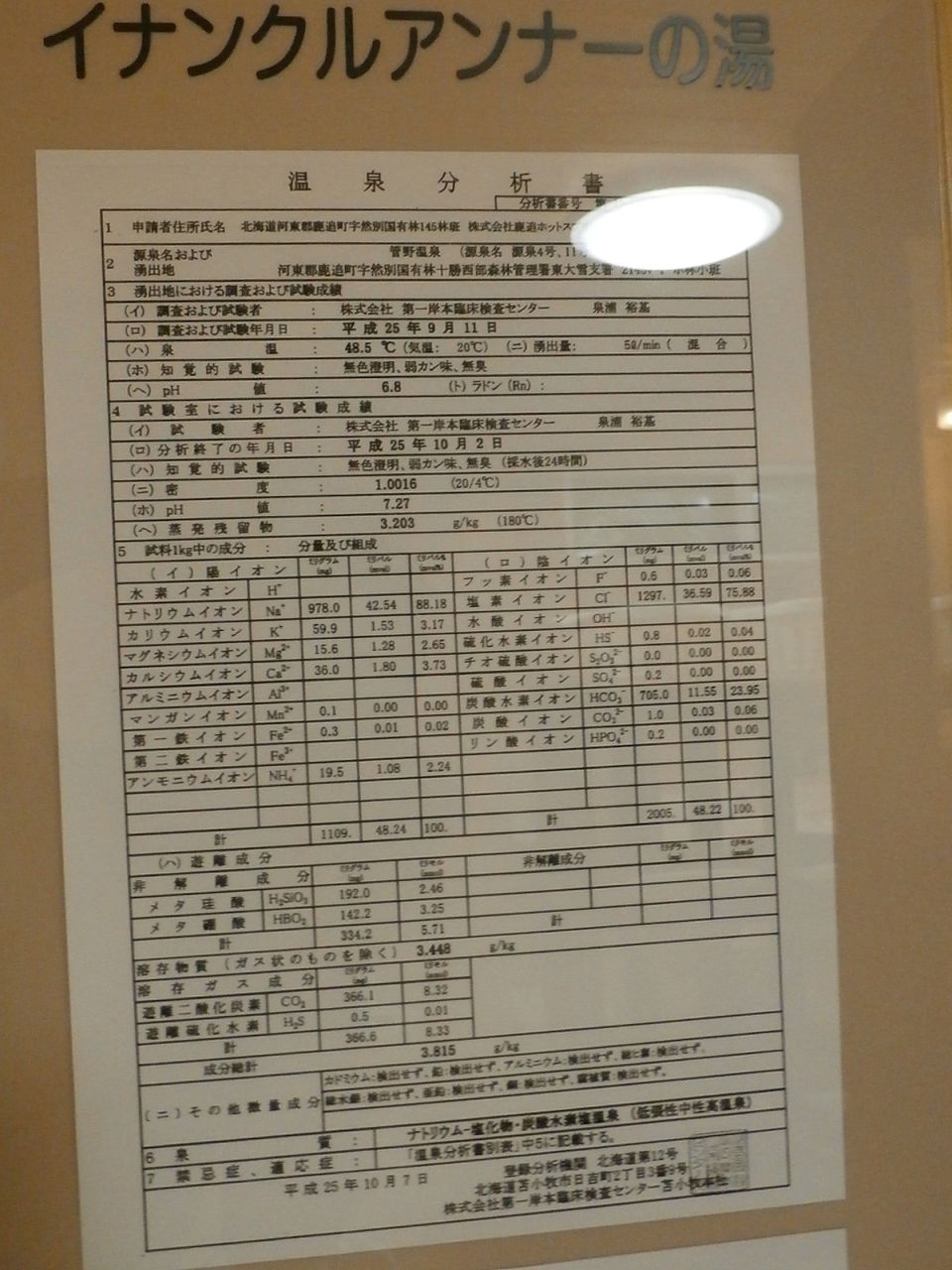 平成25年10月7日に作成した温泉分析書(第一岸本臨床検査センター苫小牧本社)。泉温:48.5℃(気温:20℃)、湧出量:5ℓ/分(混合)、pH値:6.8、溶存物質:3.448g/kg、成分総計:3.815g/kg、泉質:ナトリウム-塩化物・炭酸水素塩泉(低張性中性高温泉)(旧泉質名:含重曹-食塩泉)