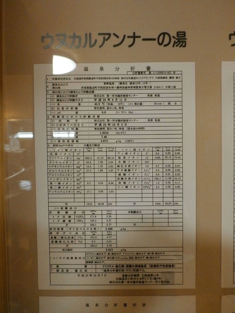平成25年10月7日に作成した温泉分析書(第一岸本臨床検査センター苫小牧本社)。泉温:45.9℃(気温:20℃)、湧出量(混合):5ℓ/分(自然湧出)、pH値:6.8、溶存物質:3.359g/kg、成分総計:3.613g/kg、泉質:ナトリウム-塩化物・炭酸水素塩温泉(低張性中性高温泉)(旧泉質名:含重曹-食塩泉)