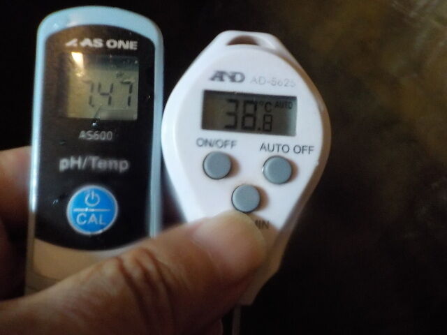 浴槽:温度38.8℃、pH7.47、ORP値は39mvに収束した。