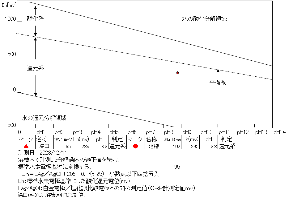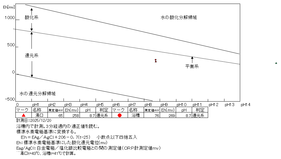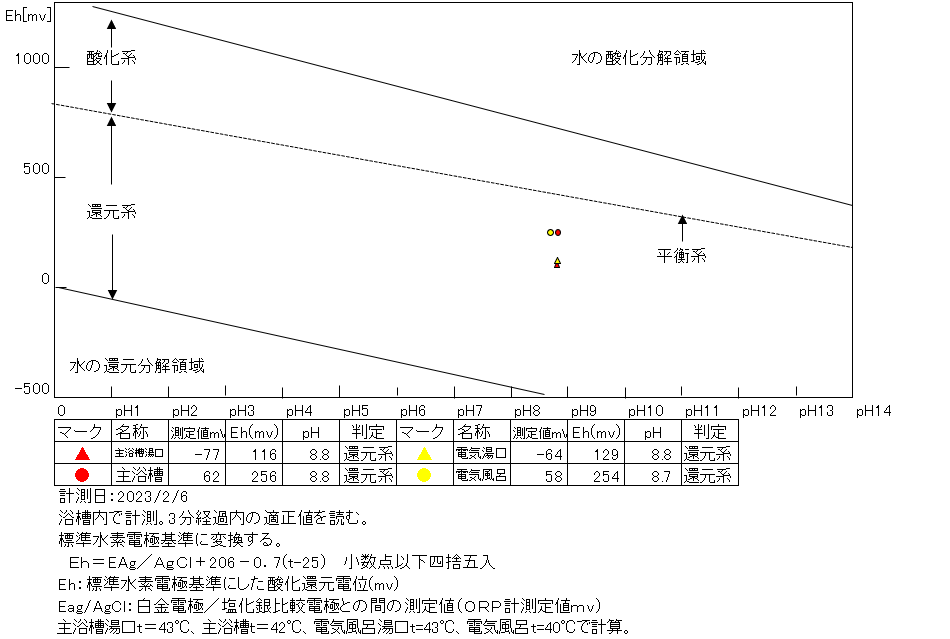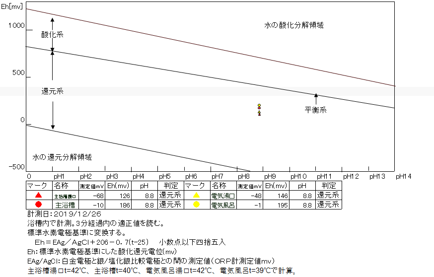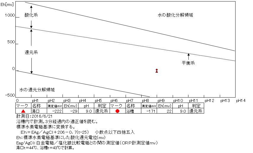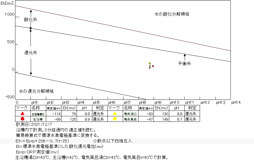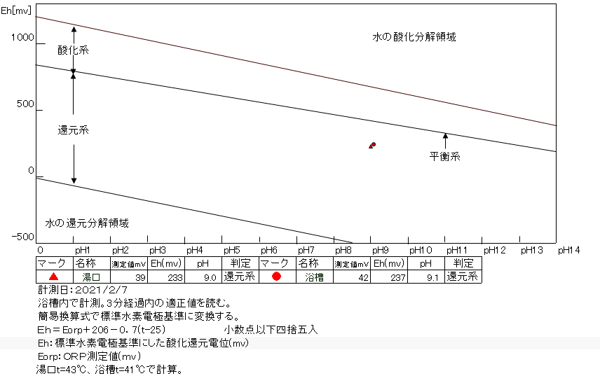 還元系にあり、温泉の鮮度は良好である。 浴槽:温度39.3℃、pH8.8、ORP値は-1mvに収束した。