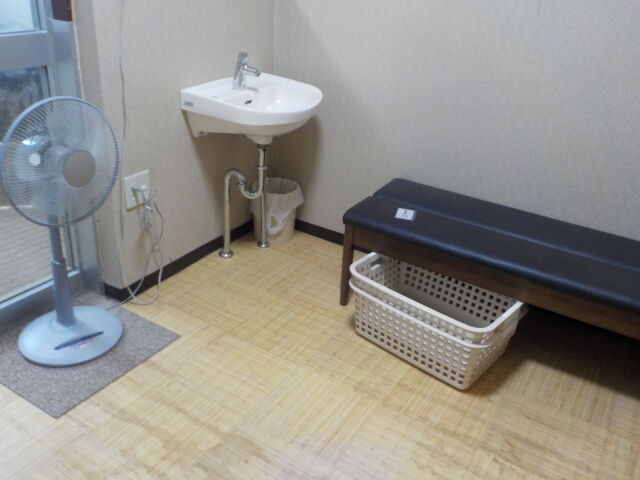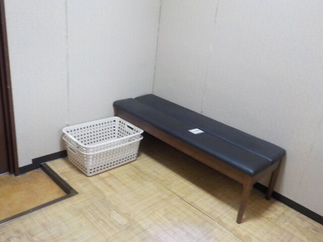 子たぬき6号。照明SWは廊下側。長いす、脱衣かご、手洗器のほかに、扇風機を設置。ドライヤーあり。