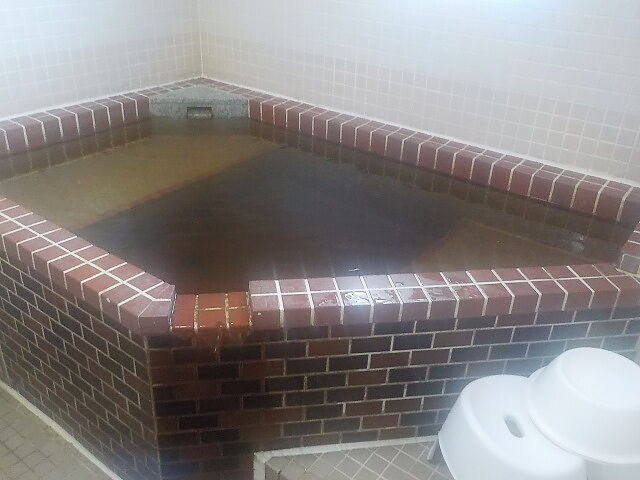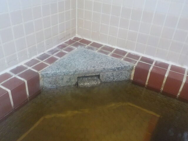 ウーロン茶色半透明の湯。注湯量は約10ℓ/分。知覚的にはほとんど無臭・微弱塩味。溢れた湯は湯縁からオーバーフローしている。適温でぬるりとした浴感あり。