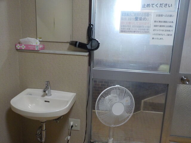 子たぬき10号。照明SWは廊下側。長いす、脱衣かご、手洗器のほかに、扇風機を設置。ドライヤーあり。