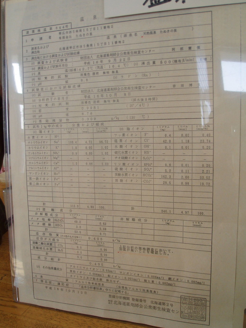 ◇温泉分析書(受付前掲示)