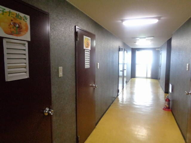上階に上がってみると、廊下を挟んで「子たぬき」の部屋が12室(4と9の数字は欠番)と一番奥のほうに「大たぬき」の部屋が一室(現在、使用不可)。「子たぬき」の部屋の細部は多少異なるものの基本的に似たような構造である。トイレは廊下にある。