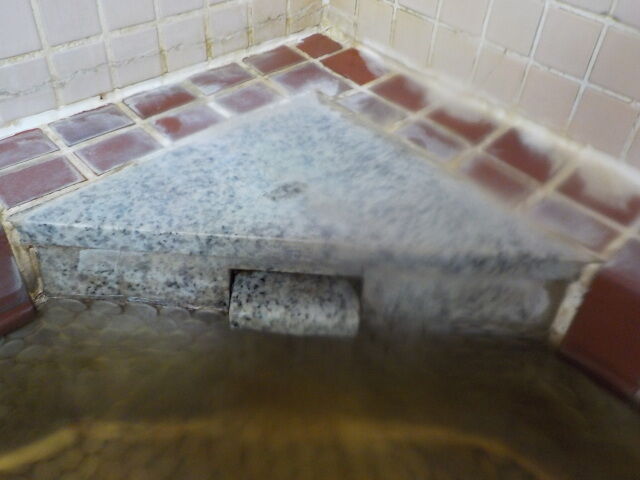 ウーロン茶色半透明の湯。注湯量は約10ℓ/分。知覚的には微弱たまご・モール臭、微弱タマゴ・重曹味。溢れた湯は湯縁からオーバーフローしている。