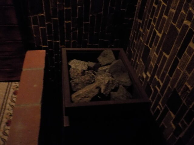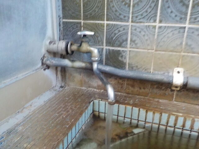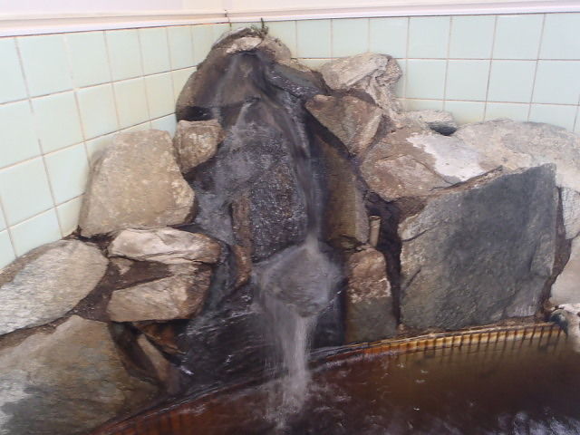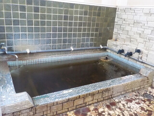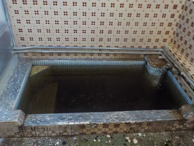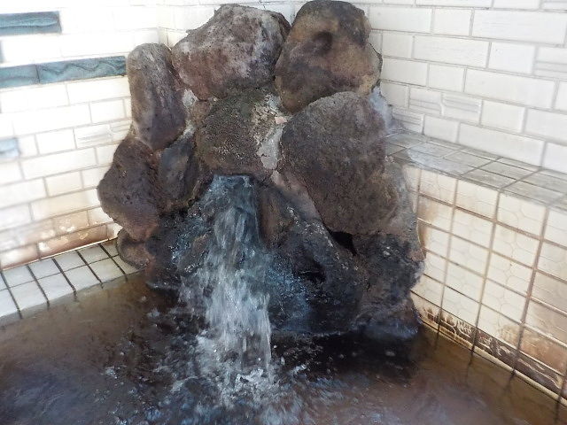 家族風呂より広く4人~5人位のスペース。ウーロン茶色ほとんど透明の湯。岩湯口から約20ℓ/分ほ注いでいる。知覚的には硫化水素臭、重曹味。湯蛇口を開放して温泉を注ぎ入れることも可能。溢れた湯は湯縁からオーバーフローしている。