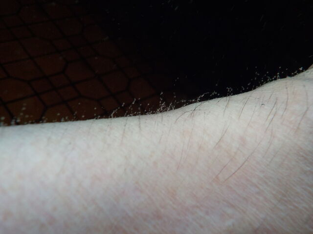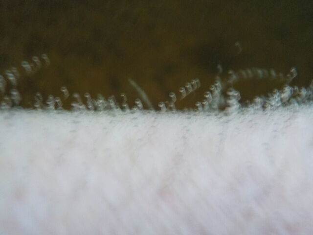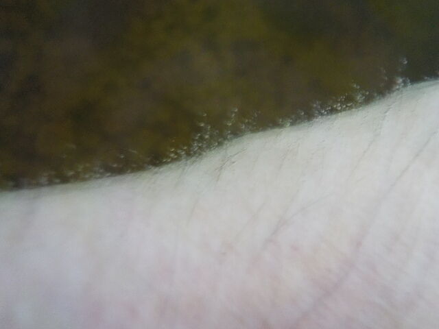 弱めながらモール系のぬるりとした浴感あり。湯口周辺は約30秒以内、湯縁周辺は約1分位で体毛に白い気泡が付着する。
