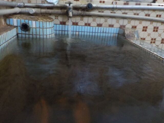 扇形の湯船にウーロン茶色半透明の湯が満ちている。注湯量は約30ℓ/分。知覚的には、硫化水素臭・微弱モール臭、微弱重曹・タマゴ味。溢れた湯は湯縁からオーバーフローしている。