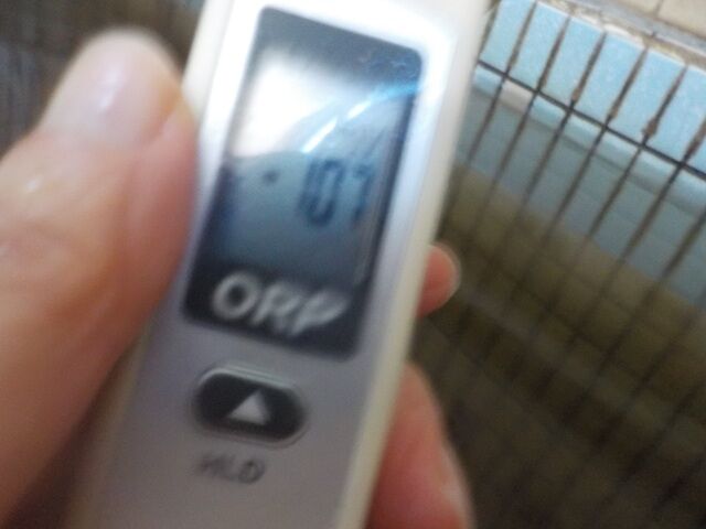 2012/4/20、12時30分頃、浴槽内でORP計測(湯口は洗面器で採水)。源泉かけ流しで、塩素系薬剤未使用。