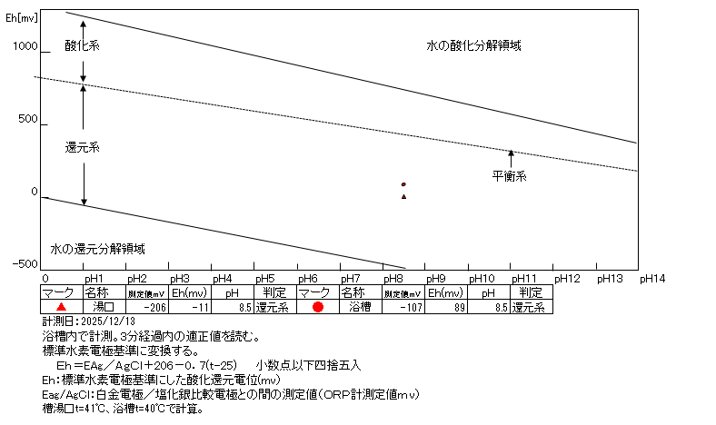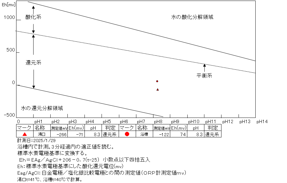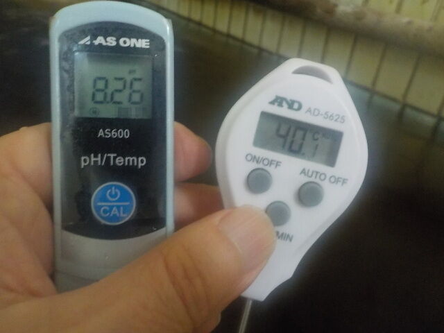 浴槽:温度40.3℃,pH8.21、ORP値は-260mvに収束した。