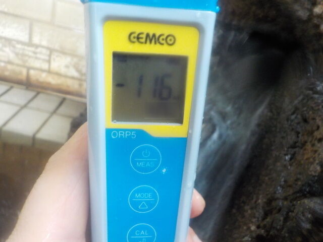 2022/1/12、12時5分~15分、浴槽内でORP計測(湯口はミニボトルで採水)。源泉100%掛け流しで、塩素系薬剤未使用。