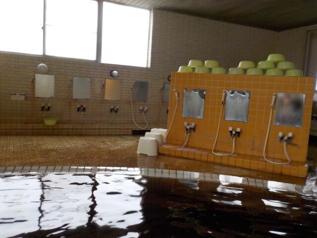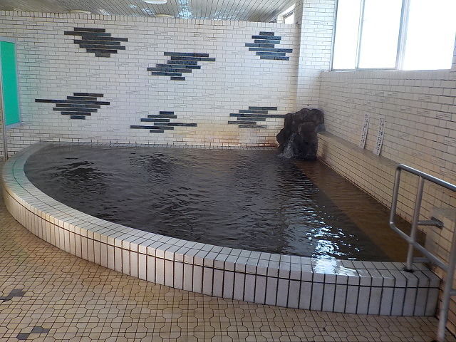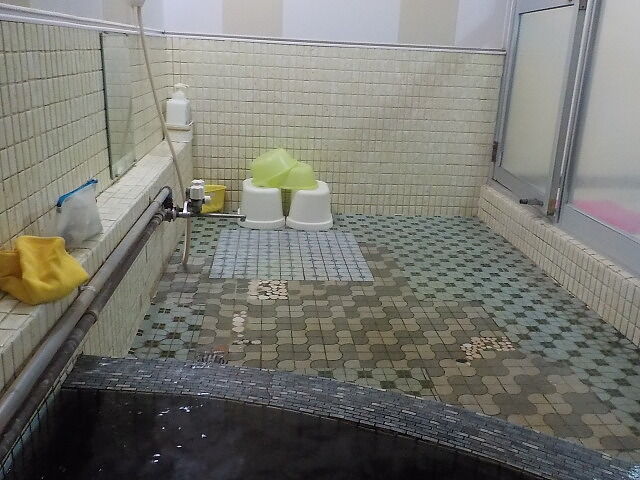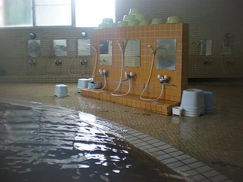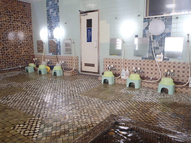 鄙びたタイル張りの浴室に、主浴槽、ぬる湯、水風呂、サウナを配置。ぬる湯は、地下水と源泉を混合したもので水温23度前後。シャワー付カラン7台、シャンプー・ボディソープ完備。サウナ室は15人位のスペースがある。