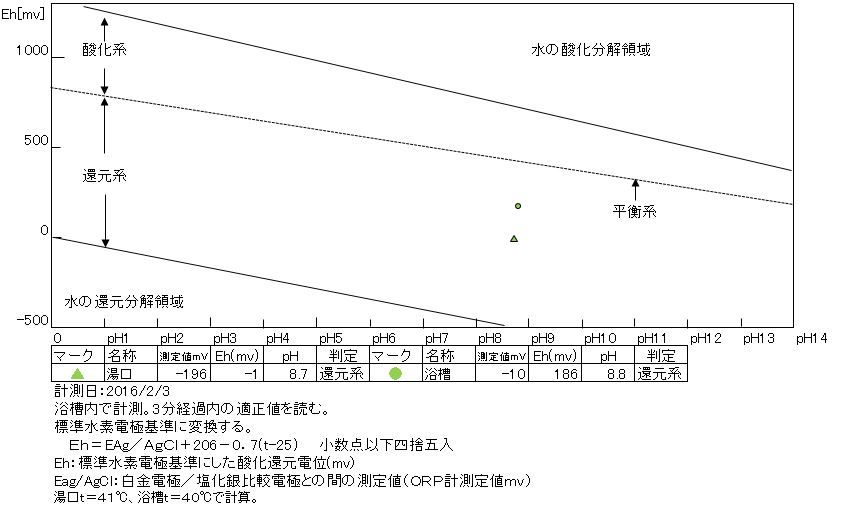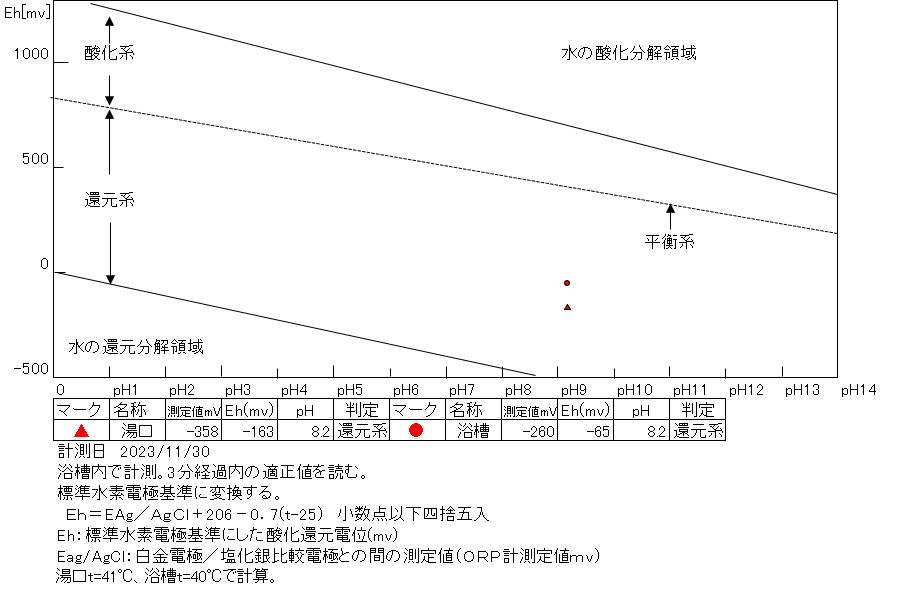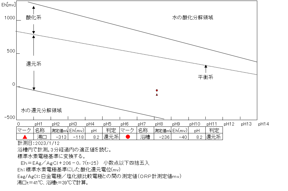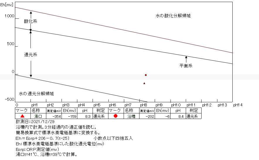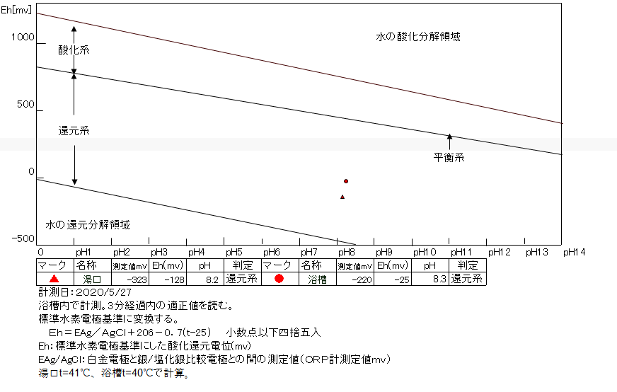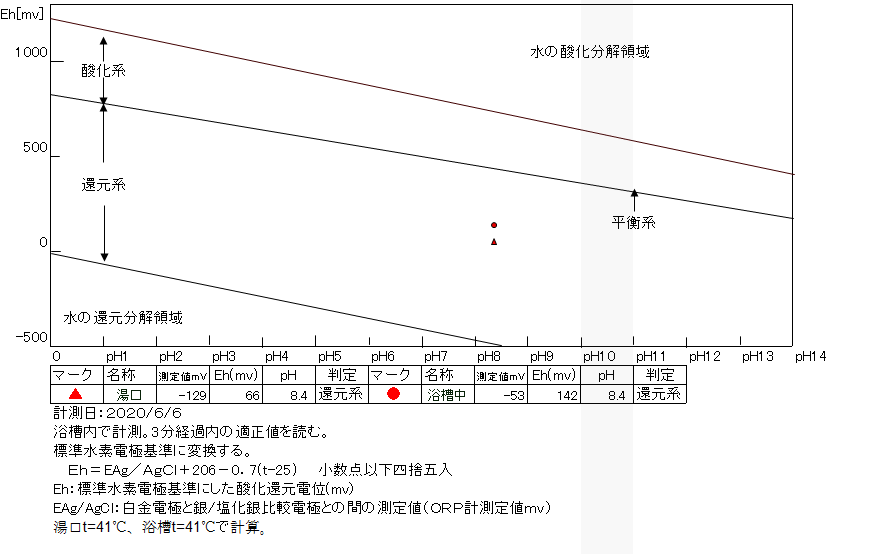 湯口:温度40.6℃、pH8.52、ORP値は-206mvに収束した。