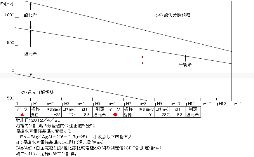 湯口:温度40.7℃、pH8.30、ORP値は-266mvに収束した。