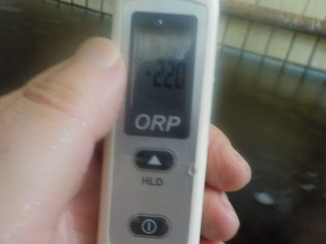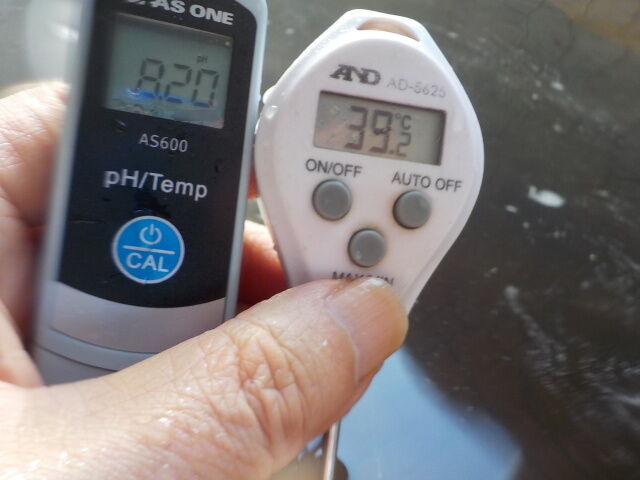 浴槽:温度39.2℃,pH8.20、ORP値は-236mvに収束した。