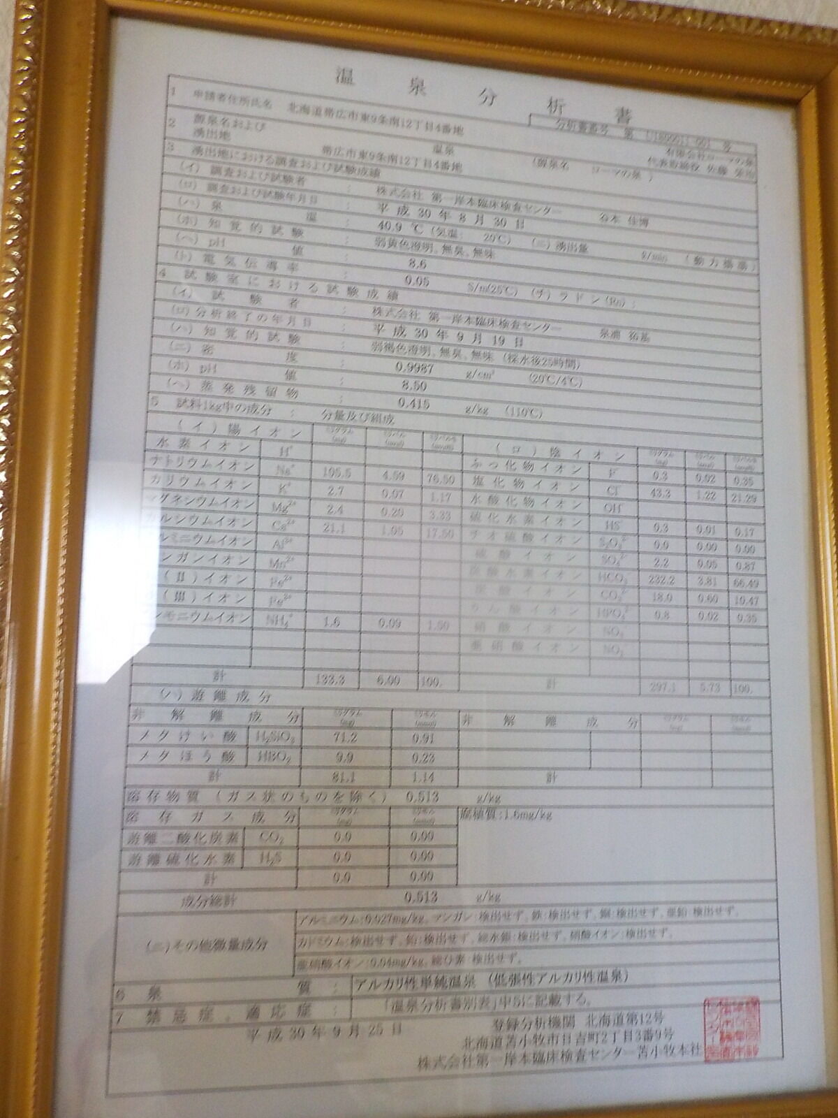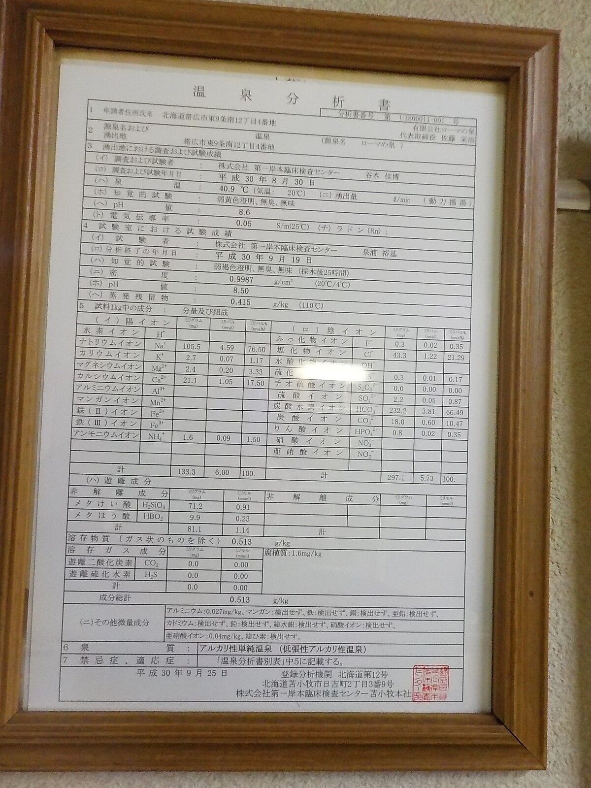 平成30年9月25日に作成した温泉分析書(第一岸本臨床検査センター苫小牧本社)。泉温:40.9℃(気温:20℃)、湧出量: ℓ/分(動力揚湯)、pH値:8.6、溶存物質:0.513g/kg、成分総計:0.513g/kg、泉質:アルカリ性単純温泉(低張性アルカリ性温泉)(旧泉質名:単純温泉) 、腐植質1.6mg/kg