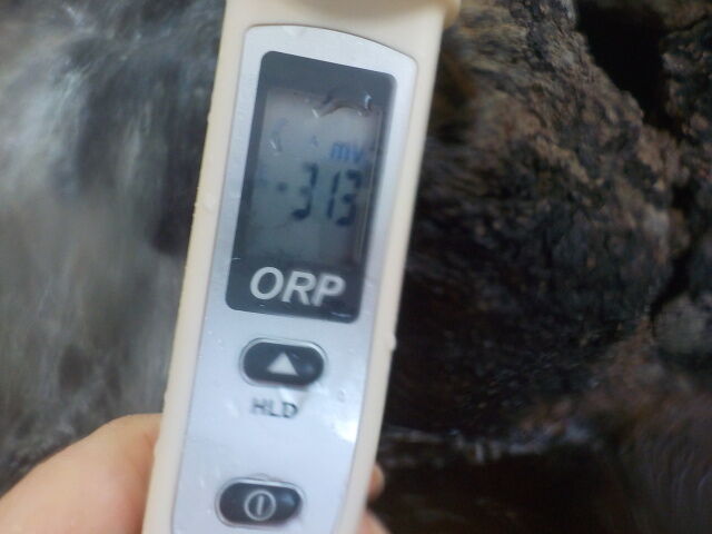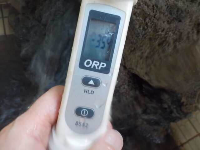 2023/11/30、12時5分~15分、浴槽内でORP計測(湯口はミニボトルで採水)。源泉100%掛け流しで、塩素系薬剤未使用。