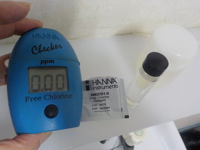 2022/1/12、12時30分頃、浴槽で試料をミニボトルで採取し、遊離残留塩素測定器で遊離残留塩素濃度を測定。