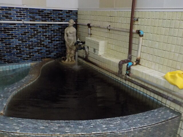 ウーロン茶色半透明の小浴槽。湯蛇口から20ℓ/分注湯。知覚的には、硫化水素臭・微弱モール臭、微弱金気・重曹・たまご味。裸婦像が置いてある。溢れた湯は湯縁からオーバーフローしている。泡付きとぬるりとした浴感を堪能できる。