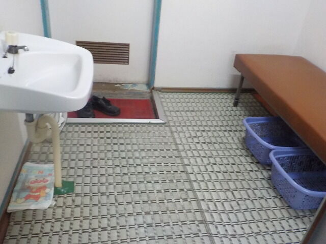 3号室。脱衣所は2帖ほどのスペースにソファーを配置。洗面台、扇風機がある。