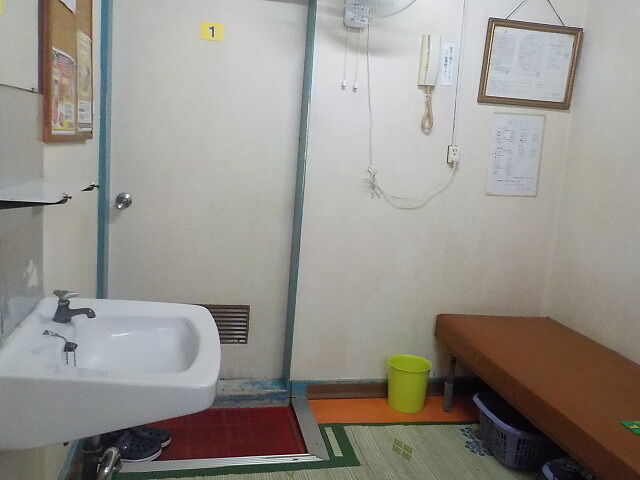 1号室。脱衣所は2帖ほどのスペースにソファーを配置。洗面台、扇風機がある。