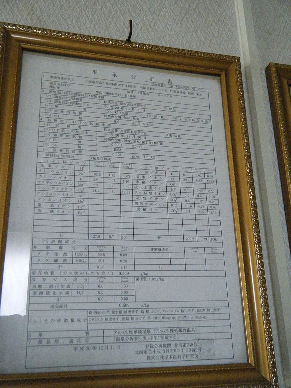 ◇温泉分析書(受付横掲示)