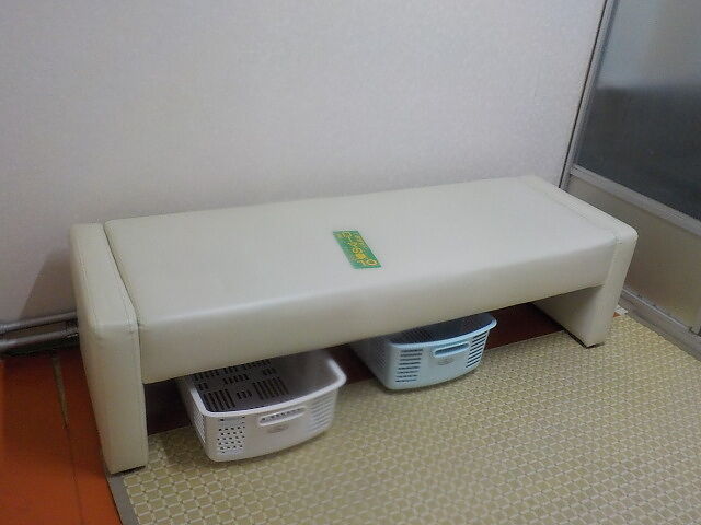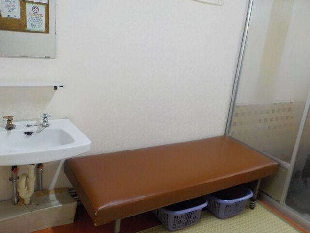 受付右手の休憩所。貴重品ロッカー(100円返却式)あり。