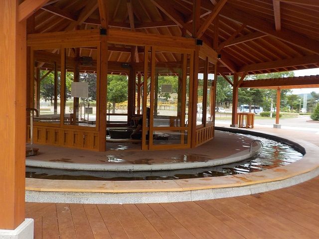 外周と中央部分にも足湯がある。外周の湯口は4箇所で溢れた湯は排湯口から排湯している。ほとんど無色透明の湯。知覚的には微弱モール臭・微弱塩味。