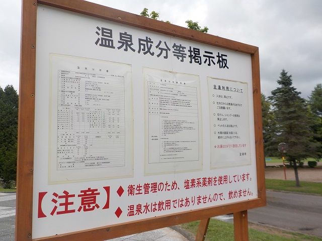 平成21年11月10日に作成した温泉分析書(太平洋総合コンサルタント)、泉温:56.4℃(気温:4℃)、湧出量:※ℓ/分(動力揚湯)、pH値:8.2、溶存物質:2.612g/kg、成分総計:2.612g/kg、泉質:ナトリウム・塩化物泉(弱アルカリ性低張性高温泉)(旧泉質:弱食塩泉) 「北海道地熱 ・温泉ボーリング井データ集~1990」によると、足寄町泉源(地質研コード219-001、1988年掘削、深度1202.7m、湧出量596ℓ/分(エアーリフト)、160ℓ/分(自噴)。