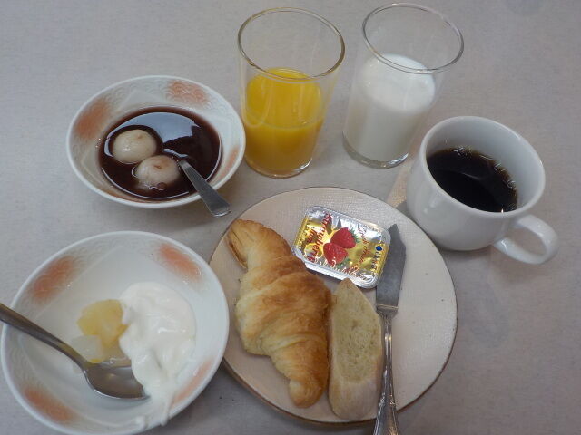 ヨーグルト、パン、お汁粉、ジュース、牛乳、コーヒー